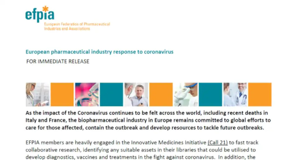 S obzirom na javnozdravstvene i humanitarne implikacije koronavirusa, europska inovativna farmaceutska industrija aktivno se uključila u globalne aktivnosti brige o oboljelima, obuzdavanje širenja bolesti i razvijanje resursa za borbu s budućim epidemijama.