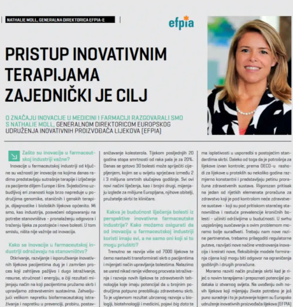 Inovacije u farmaceutskoj industriji od ključne su važnosti jer inovacije na kojima danas radimo predstavljaju sutrašnje terapije i izlječenje za pacijente diljem Europe i šire. Svjedočimo uzbudljivoj eri znanosti koja brzo napreduje u područjima genomike, staničnih i genskih terapija, dijagnostike i bioloških lijekova općenito. Mi smo, kao industrija, posvećeni odgovaranju na potrebe stanovništva – pronalaženju odgovora i traženju lijeka za postojeće i nove bolesti. U tom smislu, ništa nije važnije od inovacija.